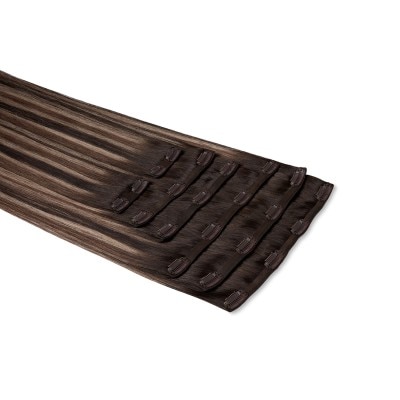 Experience the most natural-looking clip-in extensions with Beauty Works x Huda. This full 7-piece clip-in set of 100% Remy human hair, provides maximum coverage, blending effortlessly with your hair for a flawless finish. These lightweight extensions mimic the scalp for an undetectable, barely-there look. Add volume, fullness, or colour without the weight, perfect for concealing thinning areas or boosting your hair's natural thickness. The extensions allow you to experiment with colour, whether you're adding highlights, lowlights, or a contrasting hue, all without the commitment of dyes. These luxury hair enhancements deliver an instant transformation with easy at-home installation and removal in minutes. Experience a “push-up effect” that mimics natural hair, with colour-coded clips and a silicone layer to protect your hair from damage.