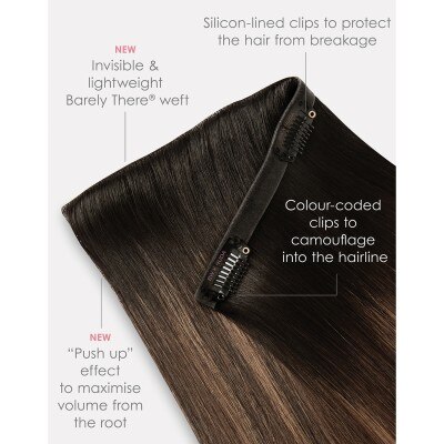 Experience the most natural-looking clip-in extensions with Beauty Works x Huda. This full 7-piece clip-in set of 100% Remy human hair, provides maximum coverage, blending effortlessly with your hair for a flawless finish. These lightweight extensions mimic the scalp for an undetectable, barely-there look. Add volume, fullness, or colour without the weight, perfect for concealing thinning areas or boosting your hair's natural thickness. The extensions allow you to experiment with colour, whether you're adding highlights, lowlights, or a contrasting hue, all without the commitment of dyes. These luxury hair enhancements deliver an instant transformation with easy at-home installation and removal in minutes. Experience a “push-up effect” that mimics natural hair, with colour-coded clips and a silicone layer to protect your hair from damage.