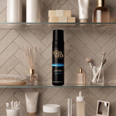 Step 2 Pump foam applicator firmly. Apply Bondi Sands Self Tanning Foam liberally to a Bondi Sands Application Mitt. Use a long, sweeping motion to apply to legs, arms and body. Use remaining residue on mitt to apply to face, elbows and knees.