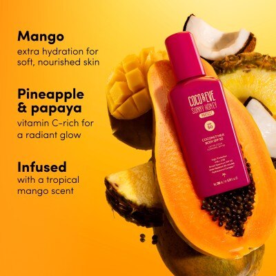 Aqua (Water, Eau), Octocrylene, Butyl Methoxydibenzoylmethane, Butyloctyl Salicylate, Ethylhexyl Salicylate, Silica, Diisopropyl Adipate, Propanediol, Ethylhexyl Triazone, Polyglyceryl-3 Methylglucose Distearate, Polyester-7, Lauryl Glucoside, Cocos Nucifera (Coconut) Fruit Extract, Carica Papaya (Papaya) Fruit Extract, Mangifera Indica Fruit Extract, Ananas Sativus (Pineapple) Fruit Extract, Citrullus Lanatus (Watermelon) Seed Oil, Hylocereus Undatus Fruit Extract, Helianthus Annuus (Sunflower) Seed Oil, Glycerin, Microcrystalline Cellulose, Polyglyceryl-6 Laurate, Propylene Glycol Dibenzoate, Saccharide Isomerate, Myristyl Glucoside, Sodium Stearoyl Glutamate, Diethylhexyl Syringylidenemalonate, Cellulose Gum, Ethylhexylglycerin, Tetrasodium Glutamate Diacetate, Tocopherol, Caprylic/Capric Triglyceride, Citric Acid, Sodium Citrate, Parfum (Fragrance), Phenoxyethanol, Sodium Hydroxide, Potassium Sorbate, Sodium Metabisulfite, Benzaldehyde, Rose Ketones, Tetramethyl Acetyloctahydronaphthalenes, Vanillin.