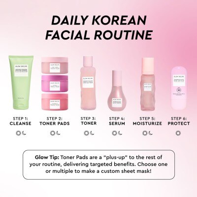 A note from Glow: Our toner pads are intentionally ultra-thin, made from plant-derived cellulose, and soaked in 3 full bottles of serum; therefore, some movement during shipping is normal and they may arrive slightly shuffled. This is expected and does not impact the formula, saturation, or results.