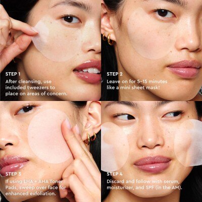 - After cleansing, lift a single pad at a time with enclosed tweezers and place on areas of concern (ex. oily areas like forehead, textured areas like cheek).
