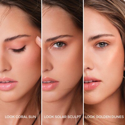 For a fresh and luminous look, apply blush to the cheekbones, nose, and eyelids, and intensify the sun-kissed effect with bronzing shades to the hollows of the cheeks, forehead, and jawline.