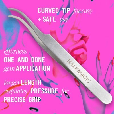 Half Magic's curved-tip Adornment Tweezers are specifically designed for easy, safe, and precise Face Gem, Face Pearl and Face Stud application. The soft curved-tip of these tweezers is designed to help you grip and apply gems effortlessly and safely– even in those notoriously hard-to-reach inner corners of the eye and lash line.