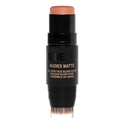 On bare skin, swipe NUDIES MATTE ALL-OVER FACE BLUSH STICK on eyes, cheeks and lips directly from the color stick then stipple in a patting motion on your face with a blending brush or your fingers to blend out any hard edges.