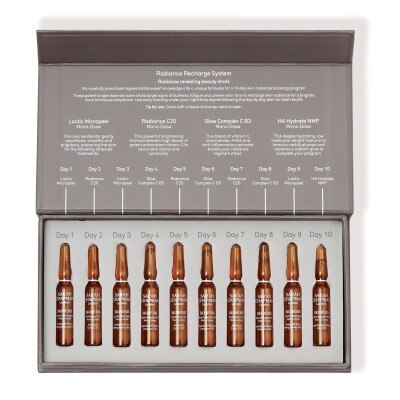 Use Sarah Chapman Skinesis Radiance Recharge System every evening under your night time regime, following the day by day plan. Cover the top of the thin glass ampoule with a tissue and snap to open. Wear an SPF in the day time during the programme.